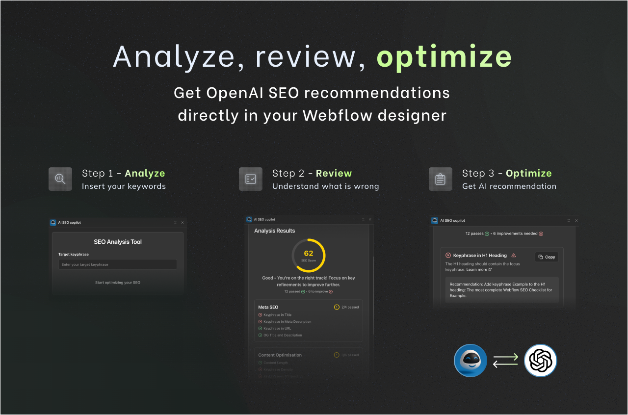 AI SEO Copilot fills a gap that Webflow users have felt for years — the lack of a native, real-time SEO tool like WordPress has with Yoast. With 15,000+ installs, it has become the most popular SEO app on the Webflow Marketplace.